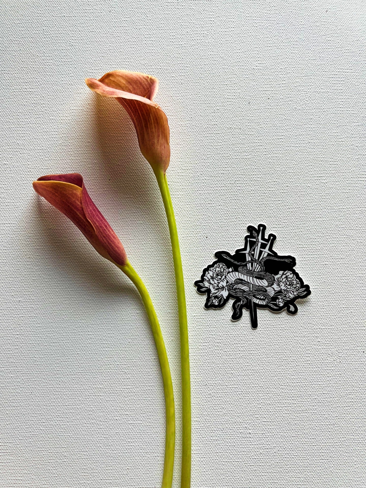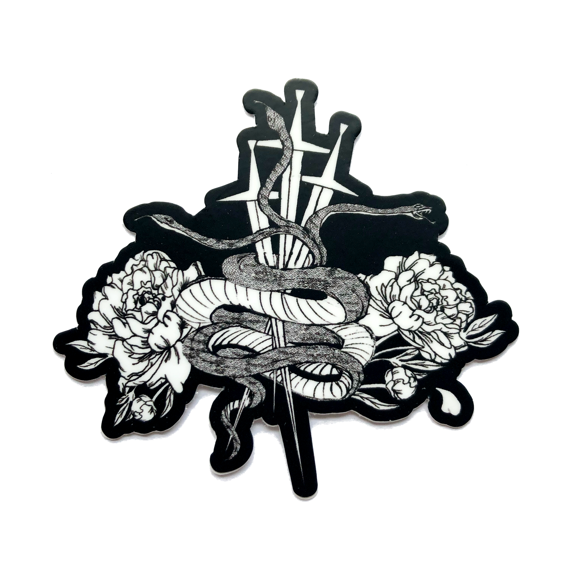 Vinyl sticker with my drawing of a three-headed snake, swords, and peonies.